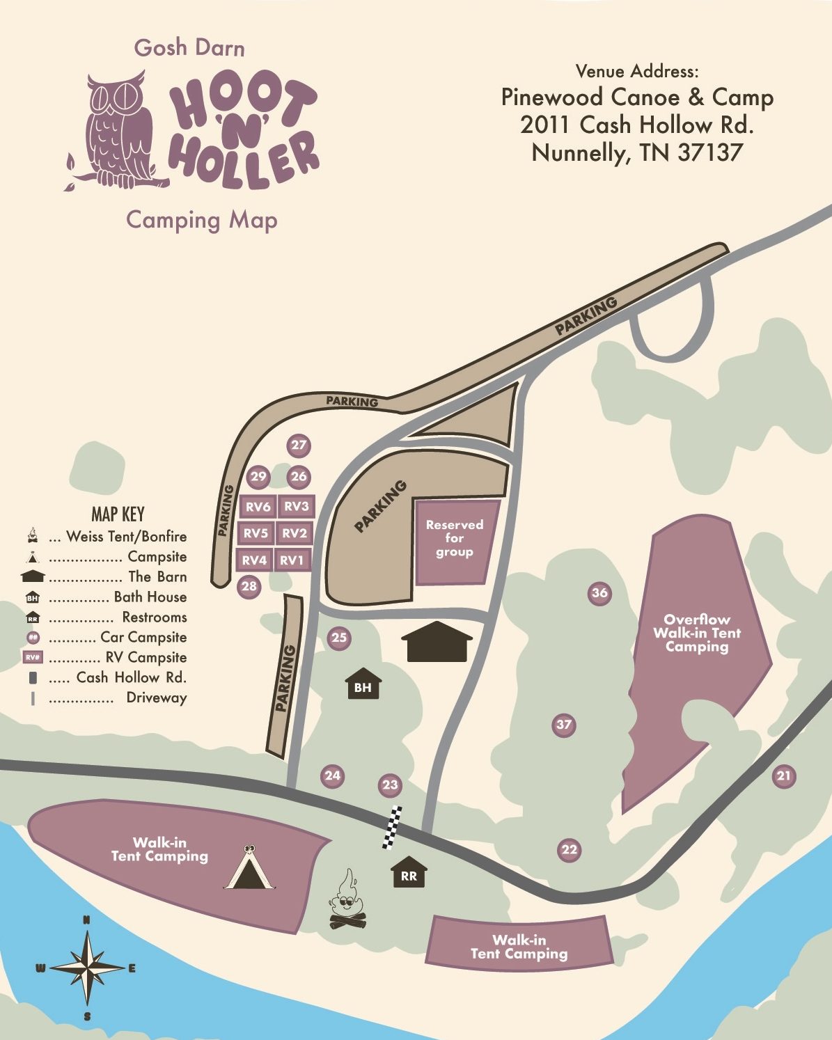 Camping is an integral part of the Gosh Darn experience, and we’d love it if y’all spent the night. For Hoot ‘n’ Holler we’re excited to announce that we’ll have both walk-in, car campsites, and RV sites available.